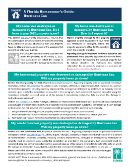 If your home has suffered catastrophic damage, there are provisions in Florida law that pertain to your property tax assessment and how it is affected when your home is destroyed by a hurricane, fire or other calamity. Our office can provide further information about this program.